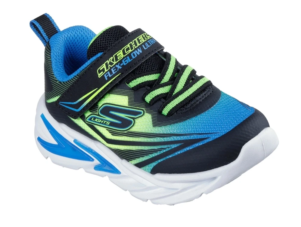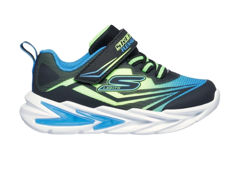 Skechers Flex-Glow Ultra blinkesko i sort, blå og limegrøn med lys i sålen