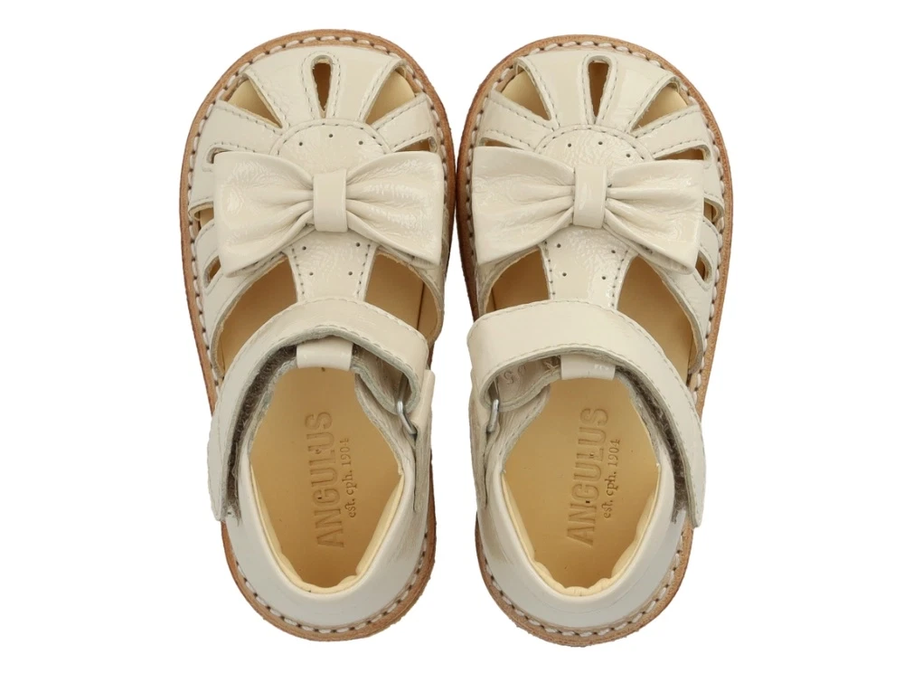 Angulus sandal i råhvid nuance til børn med fin sløjfe og justerbar velcrorem. Sandalen er fremstillet i læder med kromfrit skindfoer med lak, vatteret indersål, polstret krave og fast hælkappe.