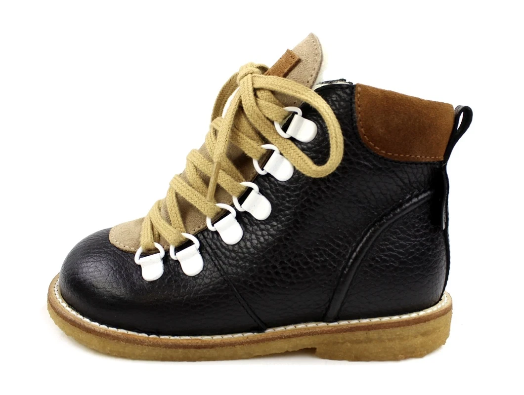 Kort sort lædervinterstøvle med brune og hvide detaljer fra Angulus.