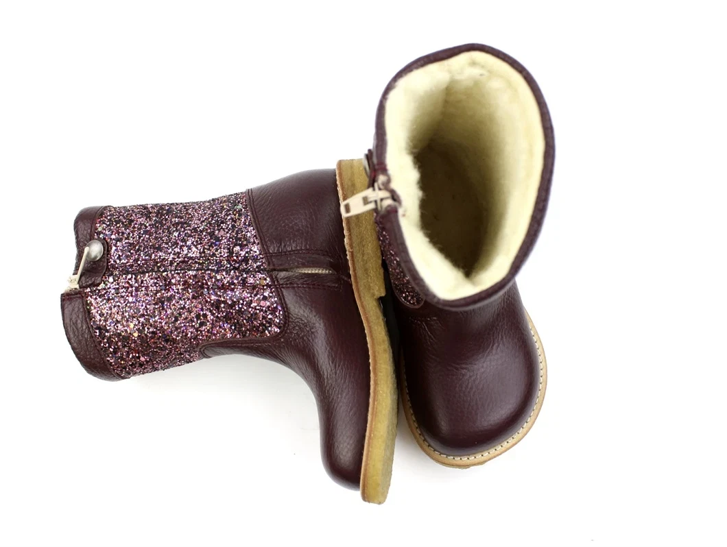 Lædervinterstøvle i bordeaux med glimmer fra Angulus.
