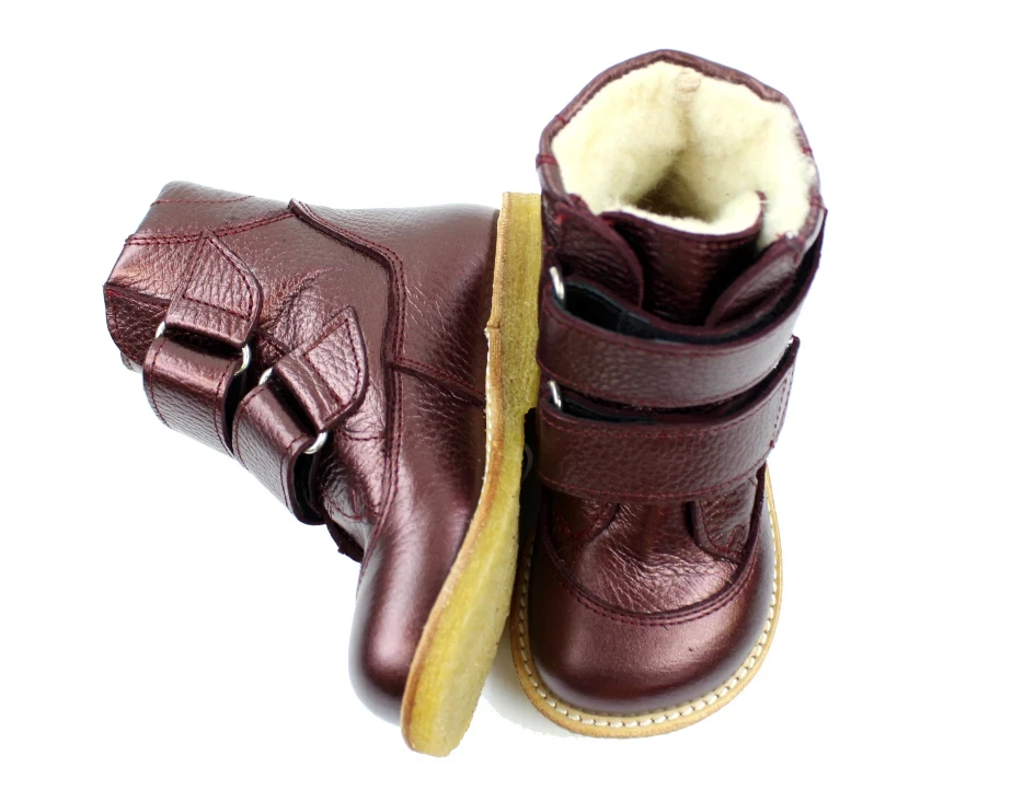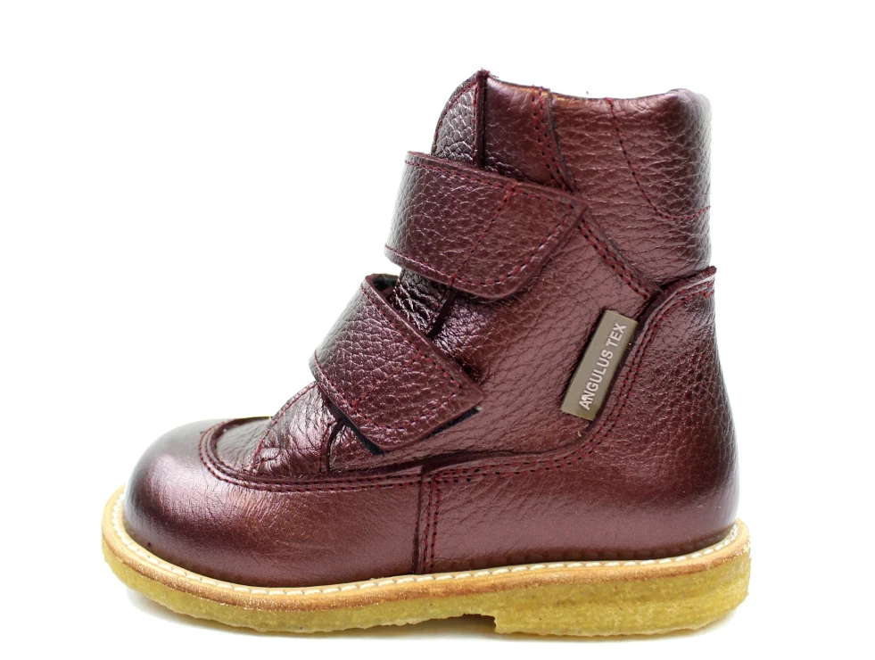 Angulus klassisk lædervinterstøvle i farven bordeuax shine. Støvlen har uldfoer og tex og lukkes nemt med to velcroremme.
