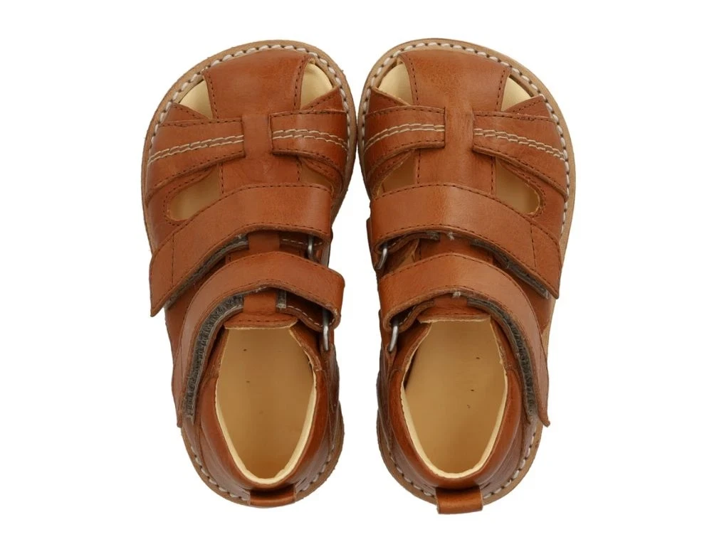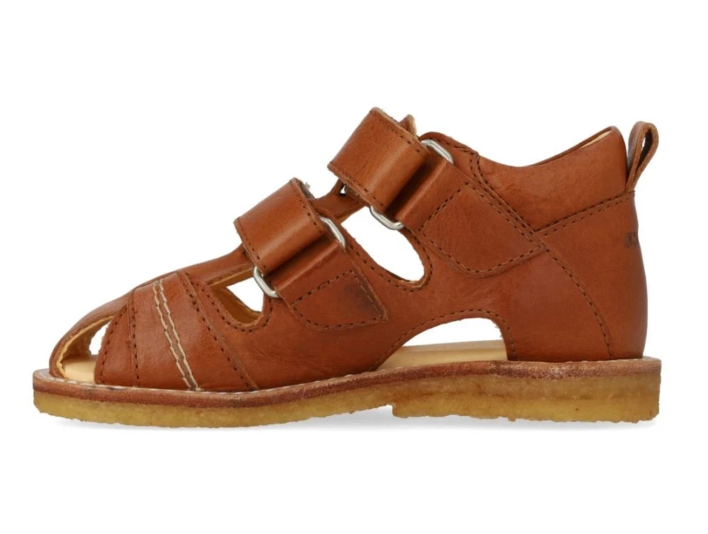 Bred sandal fra Angulus i cognacfarve med velcrolukning og justerbar rem over vristen.
