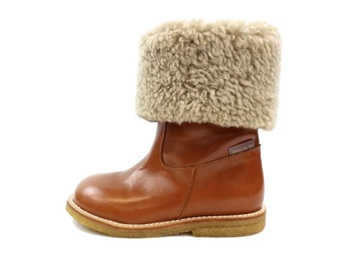 Cognacfarvede lædervinterstøvler fra Angulus. Støvlen har uldfoer og tex og lukkes med lynlås.