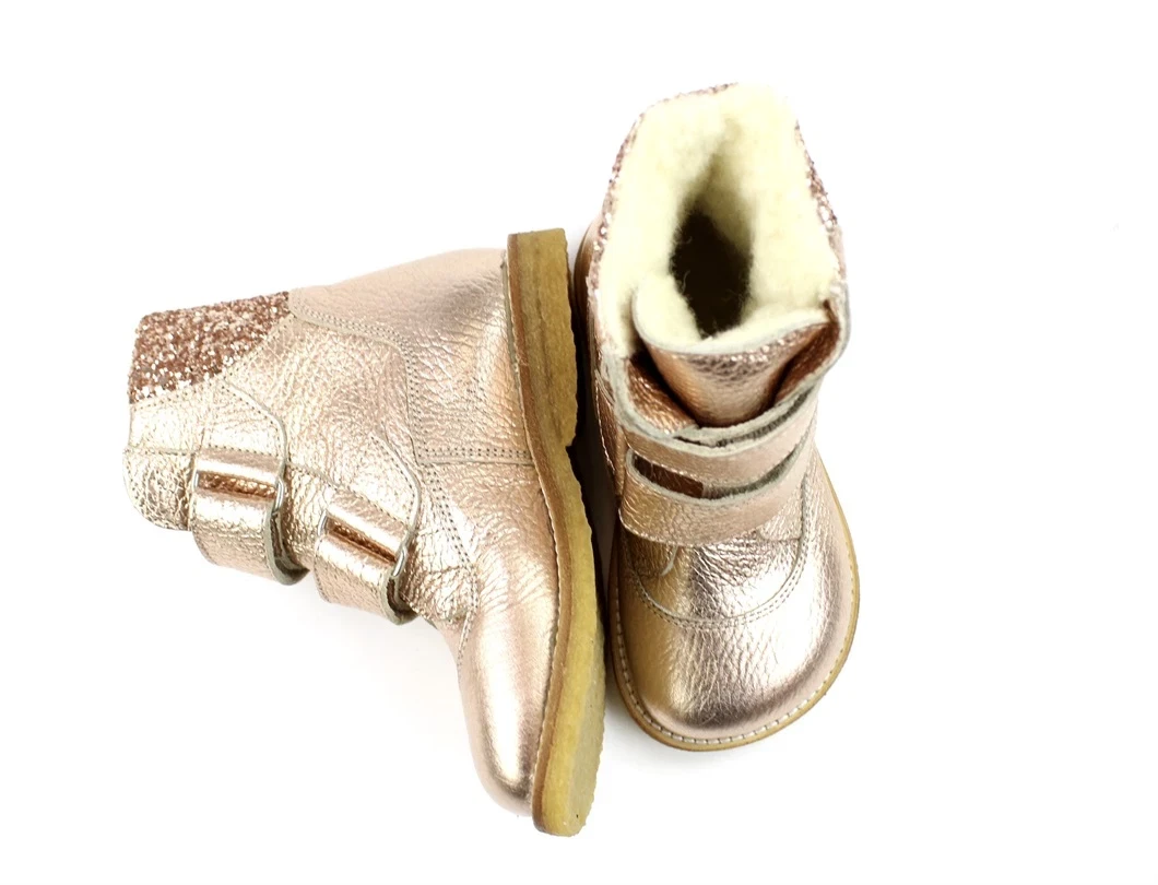 Lædervinterstøvler i farven copper med glitter øverst bagpå fra Angulus. Støvlen har uldfoer og tex og lukkes nemt med to velcroremme.