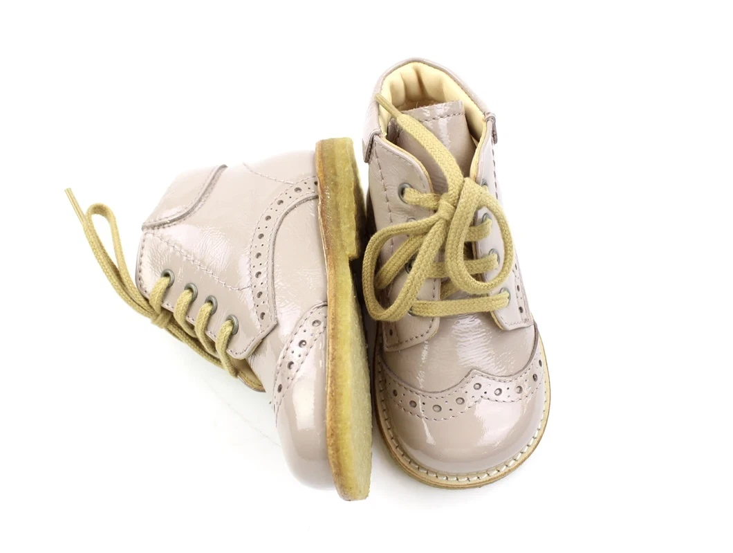 De smukkeste begyndersko i farven dusty almond med lak og dekorativt hulmønster fra Angulus.