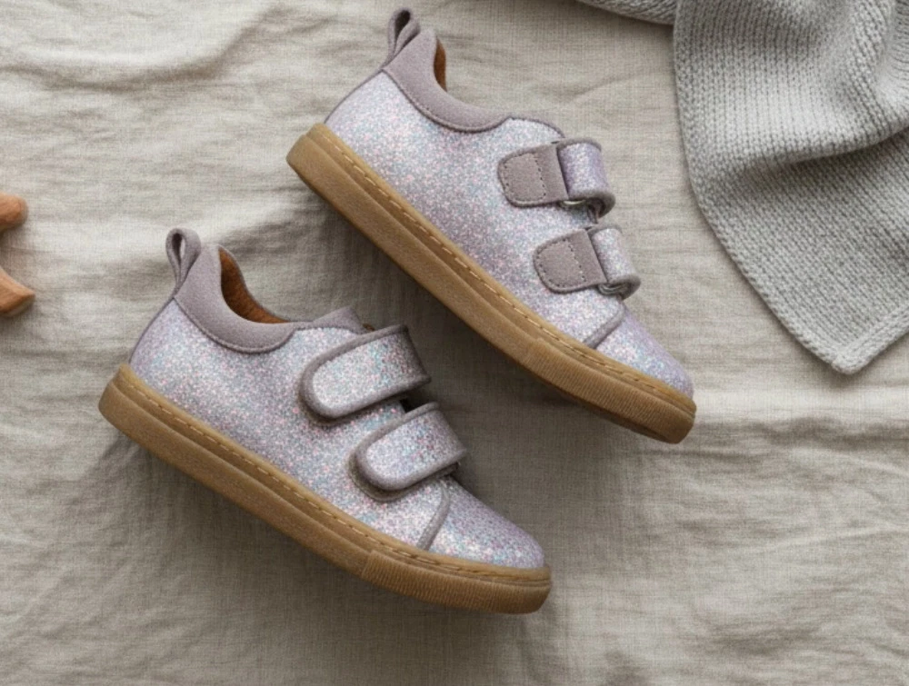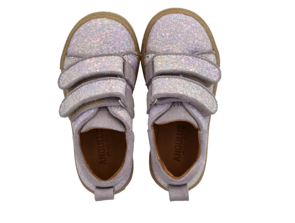 Glitter-sneaker i lilla nuance fra Angulus med ruskindskanter og justerbare velcroremme. Skoen er fremstillet i læder og designet til børn med fokus på komfort, støtte og bevægelsesfrihed i hverdagen.