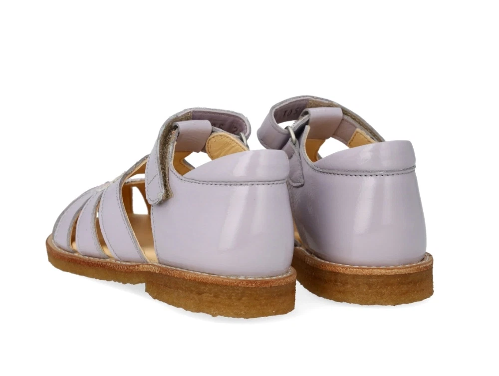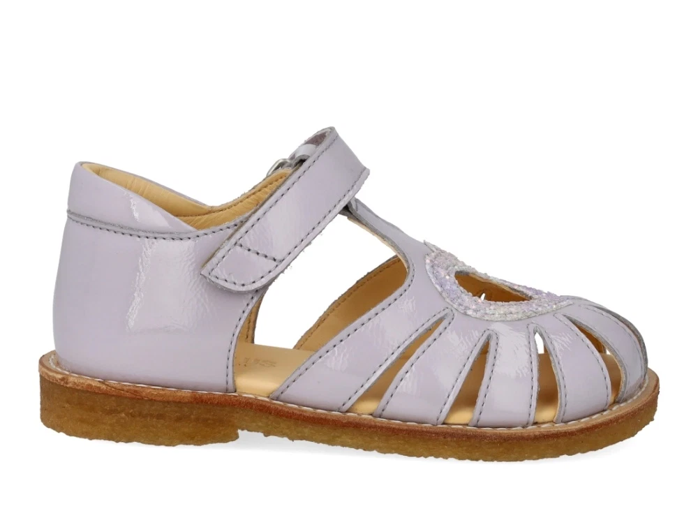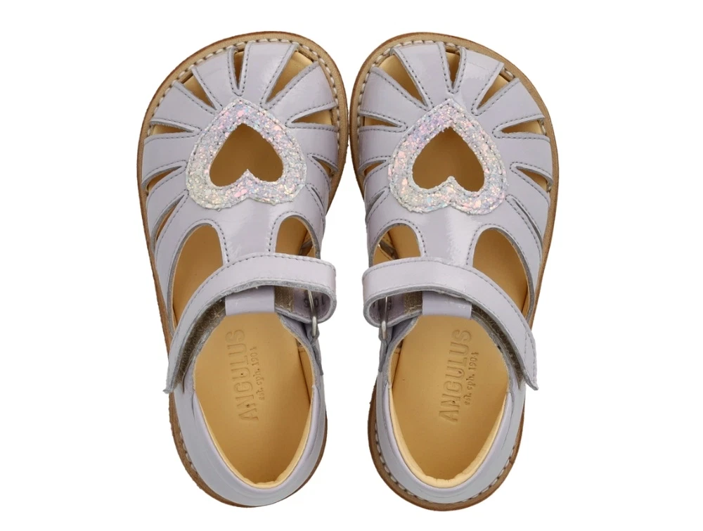 Sandal i lilla nuance fra Angulus med lukket tå, justerbar velcrorem og funklende glitterhjerte. Modellen er lavet i lakeret læder og har en fast hælkappe, polstret krave og fleksibel rågummisål, som giver god støtte omkring foden.