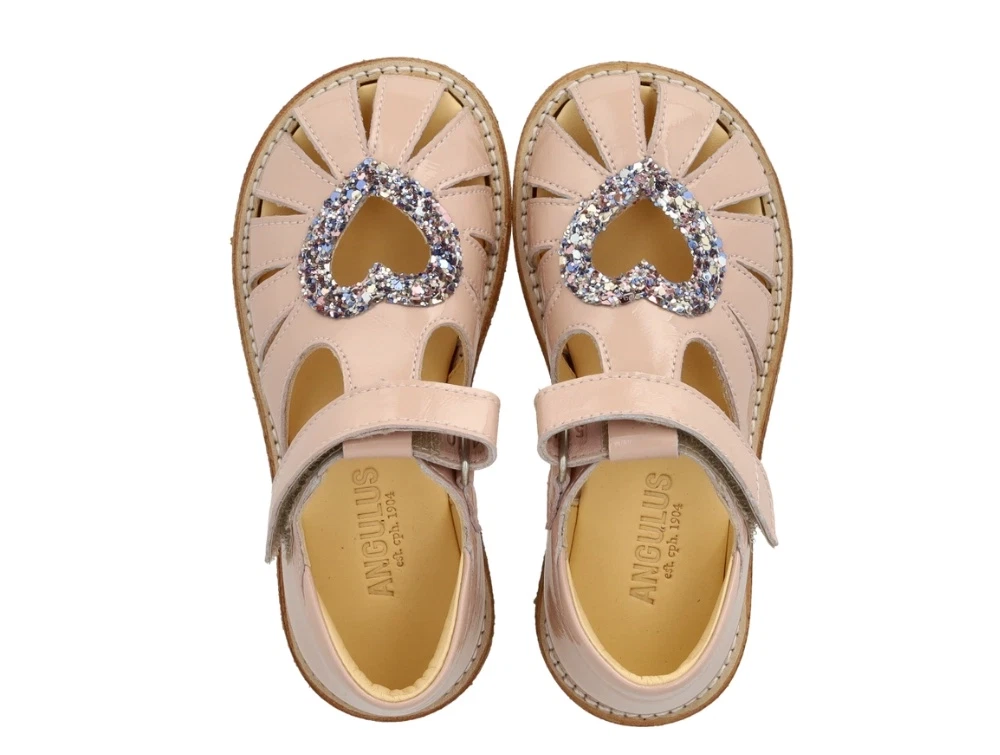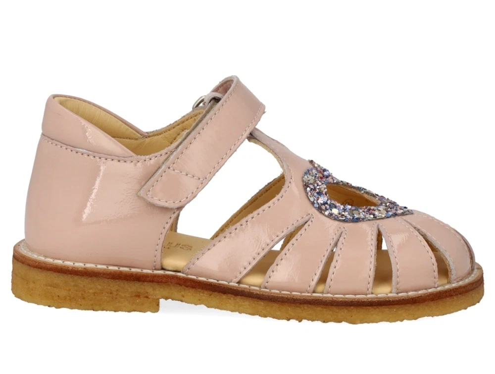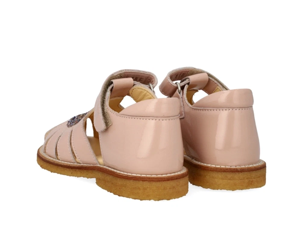 Sandal i rosa nuance fra Angulus med lukket tå, justerbar velcrorem og funklende glitterhjerte. Modellen er lavet i lakeret læder og har en fast hælkappe, polstret krave og fleksibel rågummisål, som giver god støtte omkring foden.