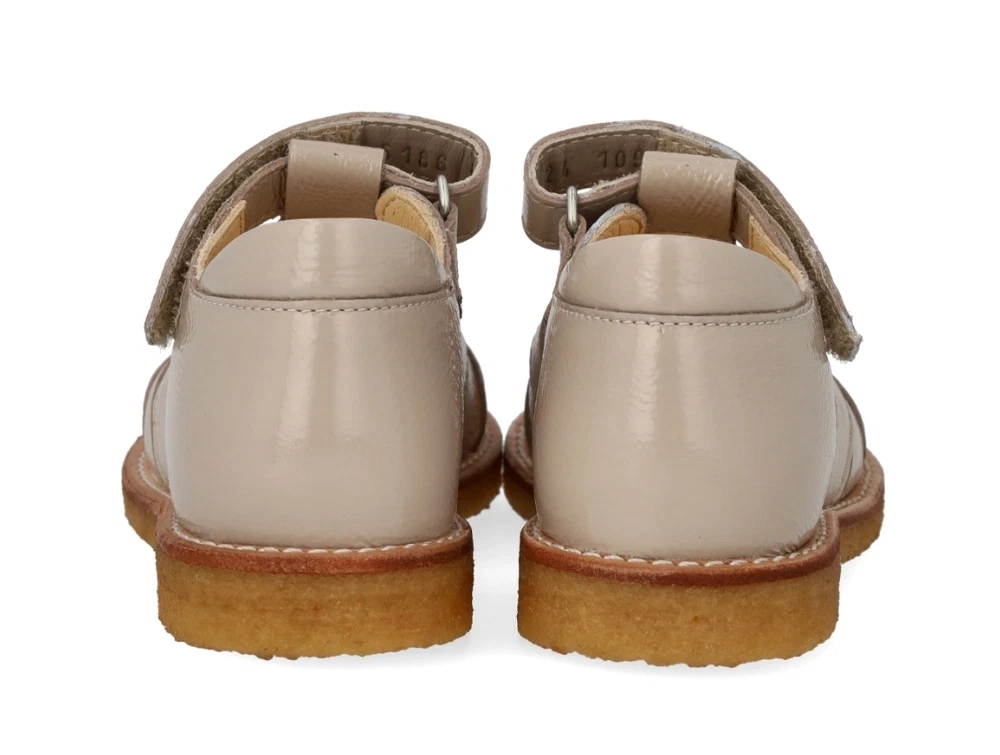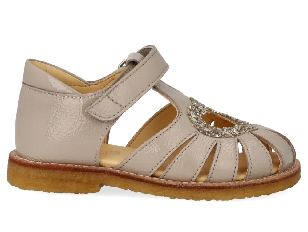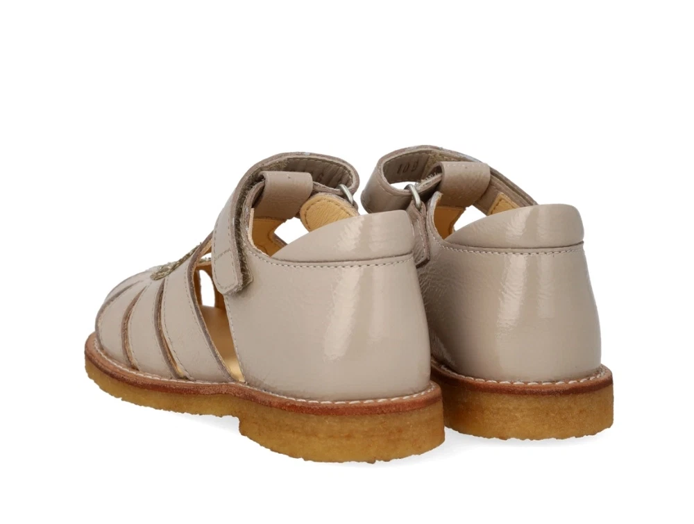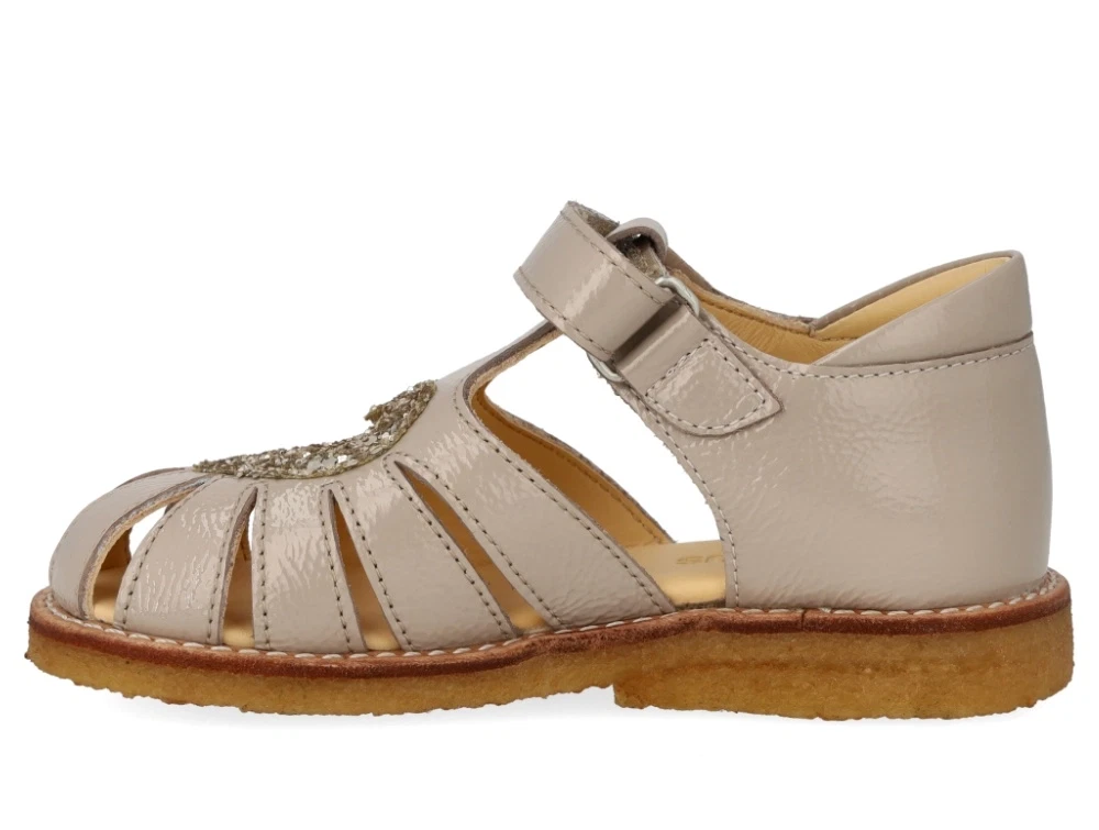 Sandal i sand nuance fra Angulus med lukket tå, justerbar velcrorem og funklende glitterhjerte. Modellen er lavet i lakeret læder og har en fast hælkappe, polstret krave og fleksibel rågummisål, som giver god støtte omkring foden.