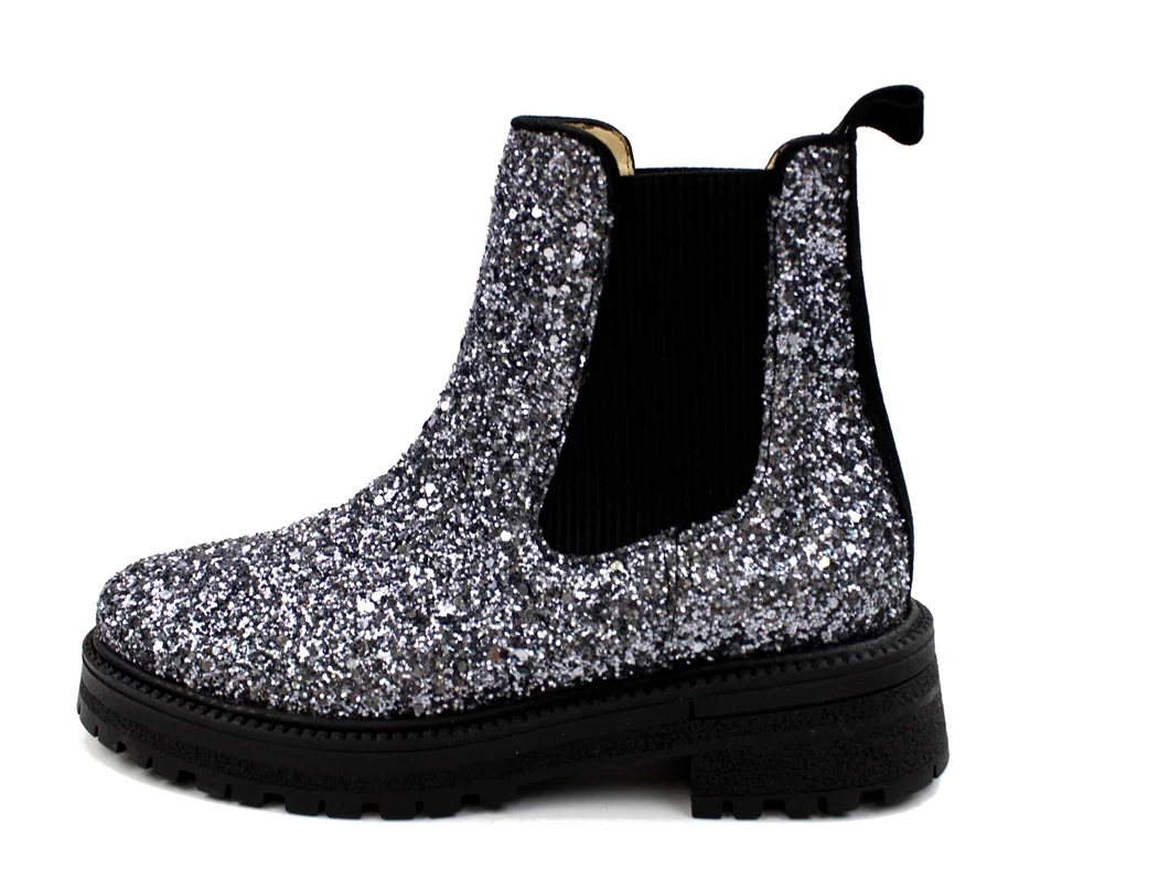 Støvlette i sølv/lavendelfarvet glitter fra Angulus. Støvletten har elastik i begge sider og en rå kant langs sålen.