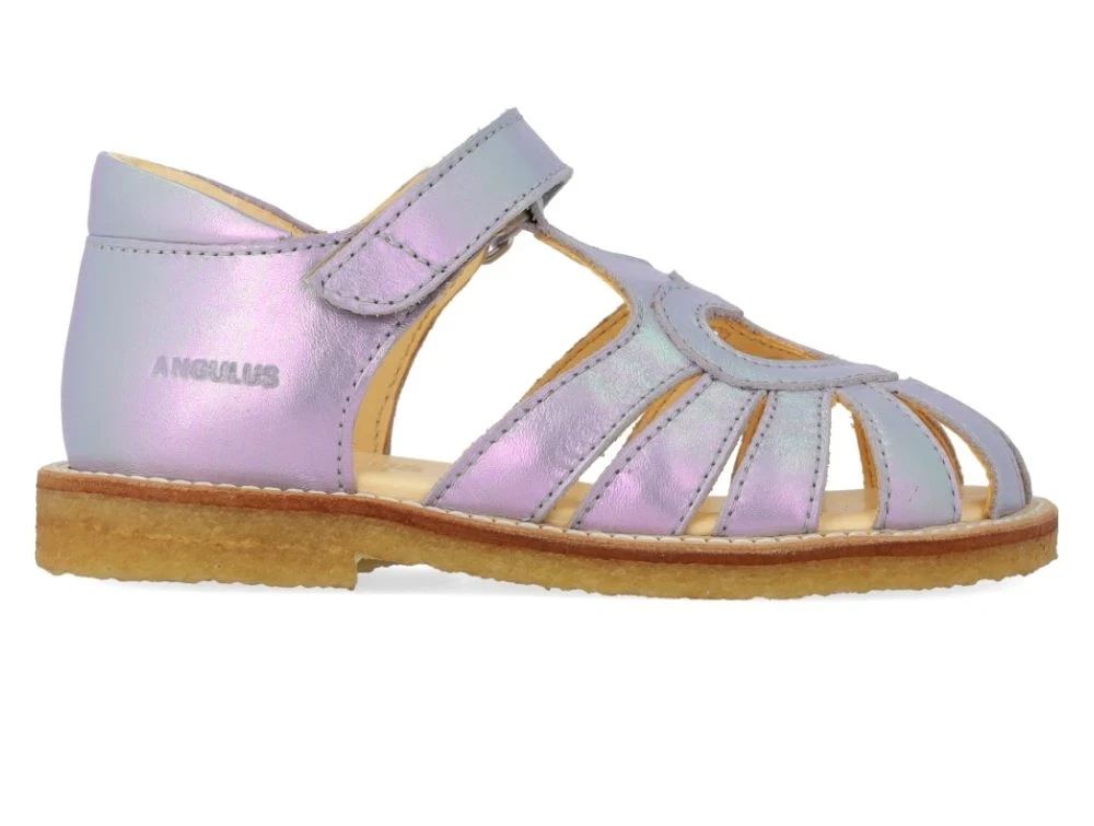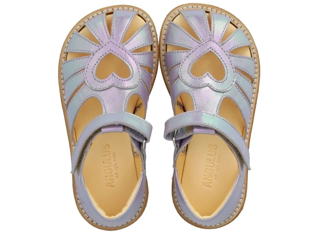 Sandal fra Angulus med hjerte-udskæring i flot lilla farve med 'shine' effekt..