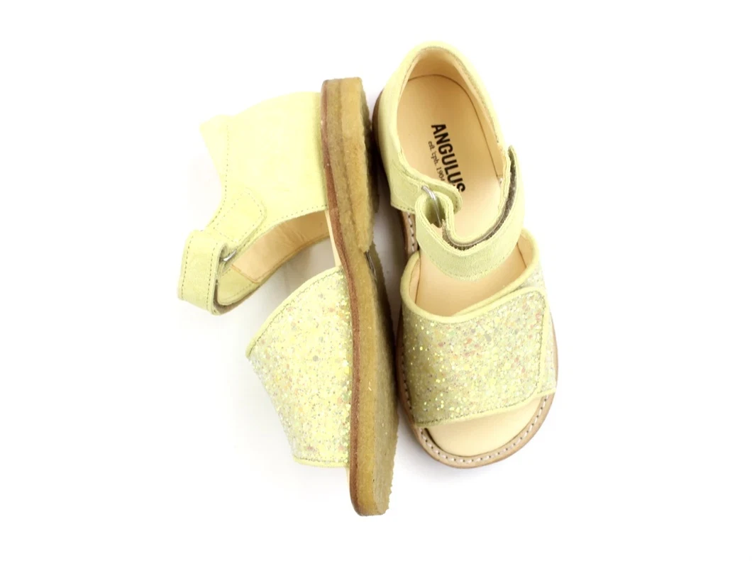 Lysegul sandal med glimmer fra Angulus. Sandalen har velcrolukning og justerbar velcro over vristen/tæerne.
