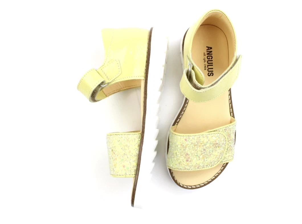 Lysegul sandal med glimmer og lak fra Angulus. Sandalen har velcrolukning og justerbar velcro over vristen/tæerne.