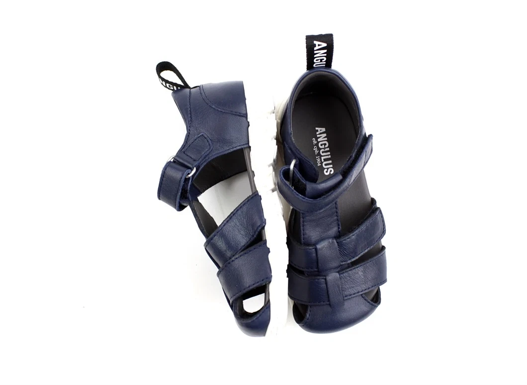 Navyfarvet lædersandal fra Angulus. Sandalen har en lukket snude og en fast hælkappe og lukkes nemt med velcro.