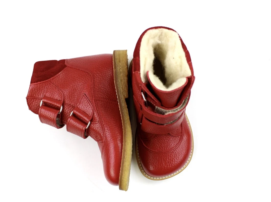 Røde lædervinterstøvler fra Angulus. Støvlen har uldfoer og tex og lukkes nemt med to velcroremme.