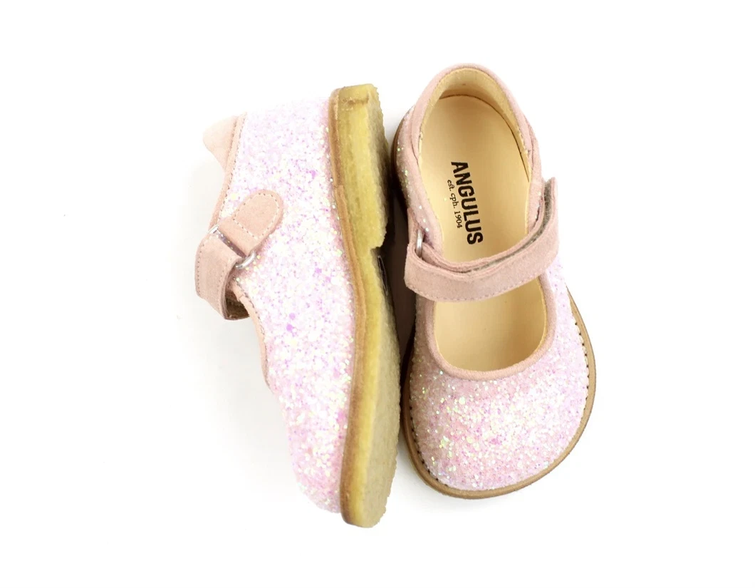 Rosa tullesko med glimmer fra Angulus. Tulleskoen lukkes nemt med velcro.