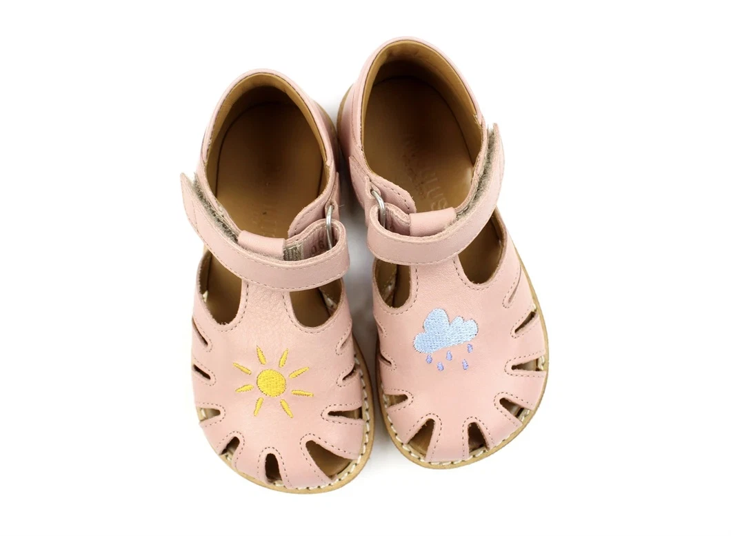 Der er en sød regnsky broderet på den venstre sandal og en sol på den højre sandal.