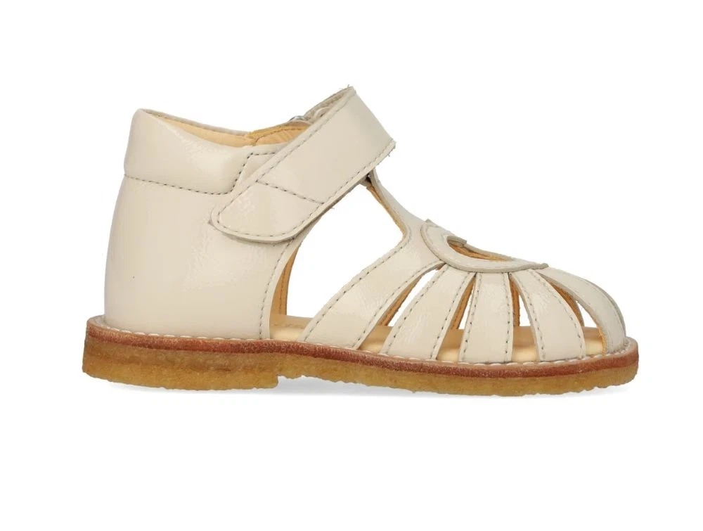 Klassisk hjertesandal fra Angulus i farven buttermilk i lakeret læder med lukket snude og blød rågummisål.