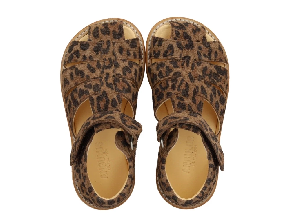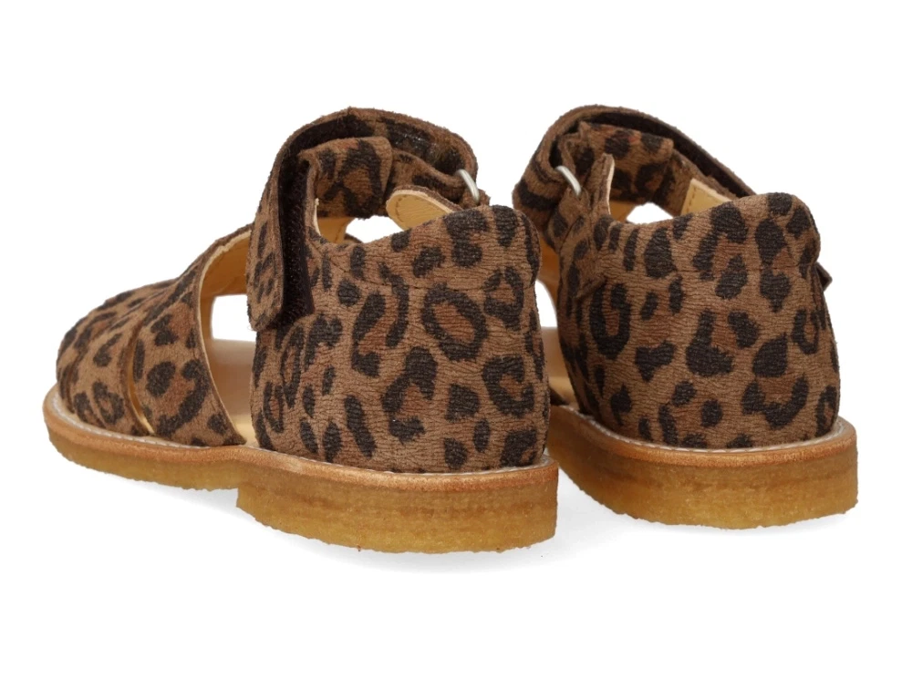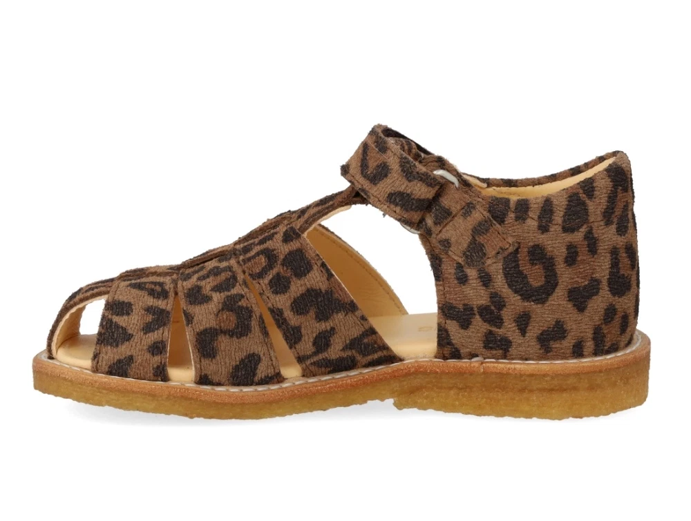 Sandal i brun nuance med leopardprint fra Angulus med lukket tå og justerbar velcrorem. Modellen er lavet i skind med print og har en fast hælkappe, polstret krave og fleksibel rågummisål, som giver god støtte omkring foden.