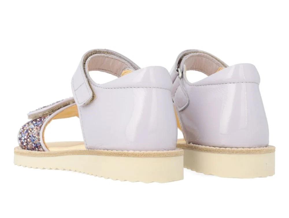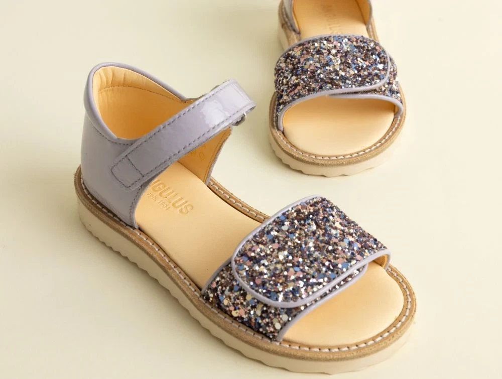 Angulus sandal i lilla pastel med glimmer og lakfinish. Sandalen har en justerbar velcrorem og velcrolukning over vristen.
