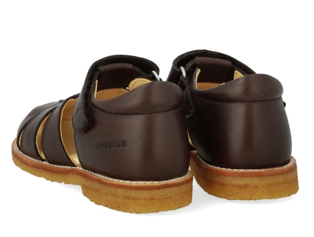 Mørkebrun lædersandal fra Angulus med velcrolukning. Sandalen har rågummisål og indvendig lædersål.