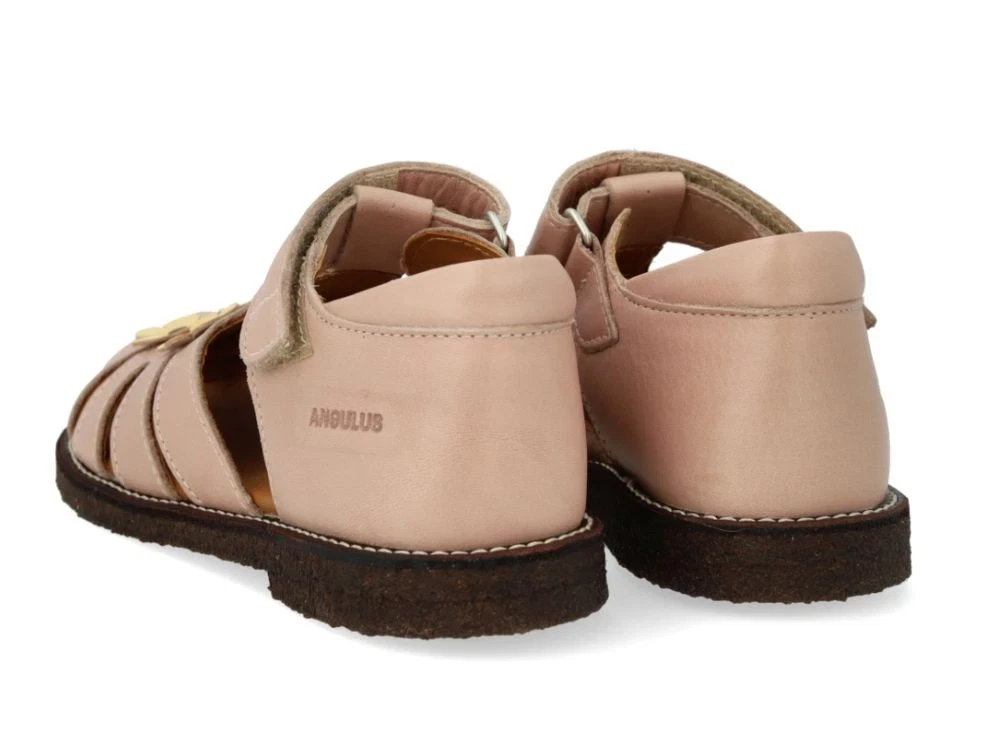 Angulus sandal i en flot kombination af rosa (rosebud) læder og gule blomsterapplikationer.