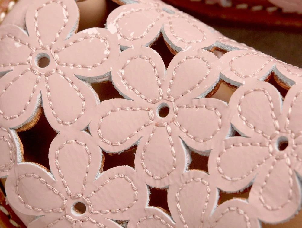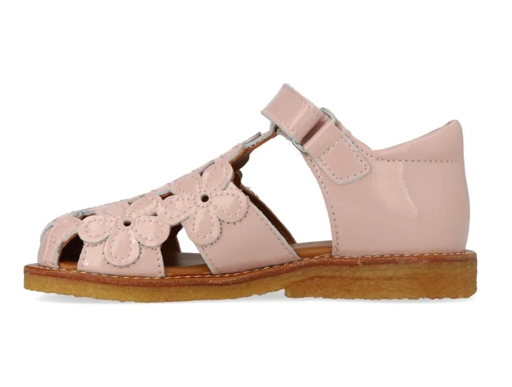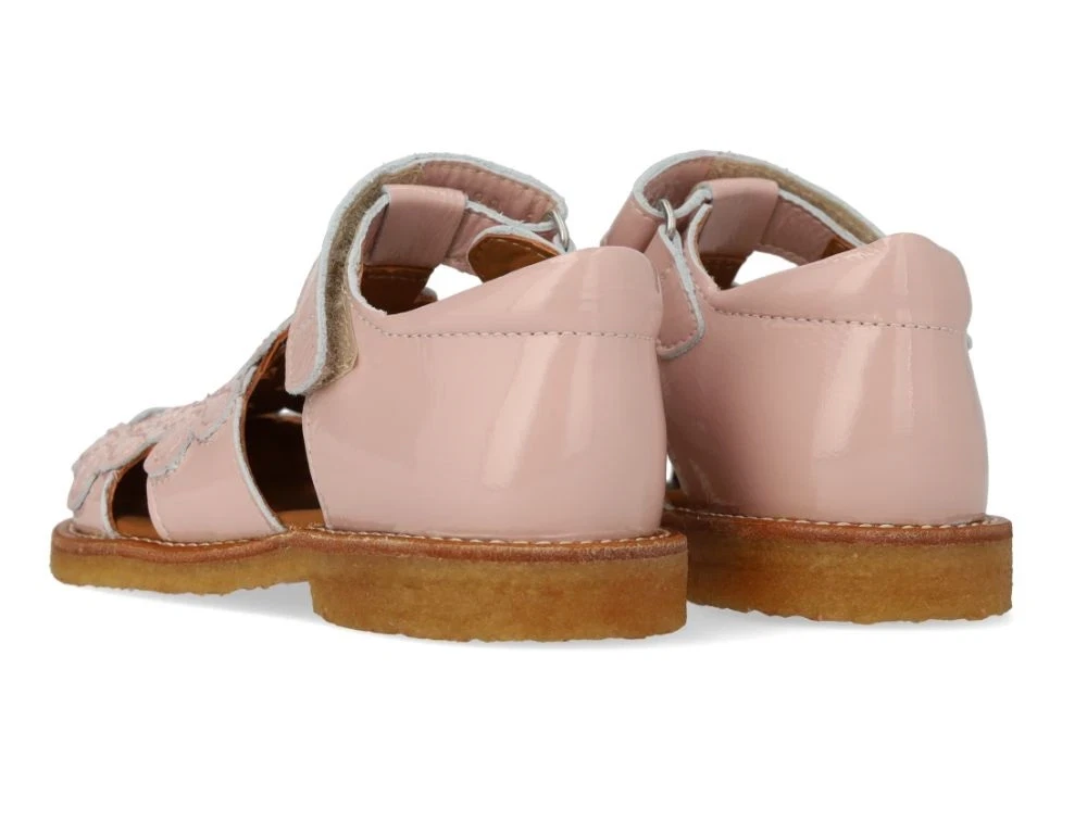 Angulus sandal i rosa (rosebud) læder med blomsterudskæringer og en fin lakfinish.