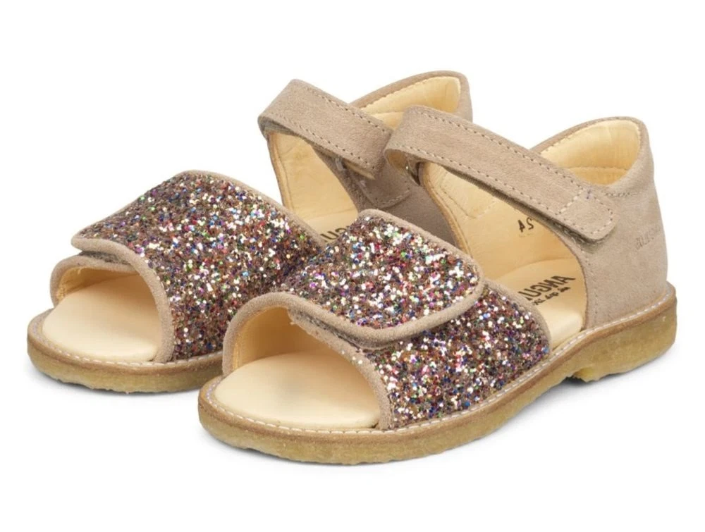 Sandal fra Angulus i sandfarve (sand multi glitter) med glimmer og fleksibel rågummisål.