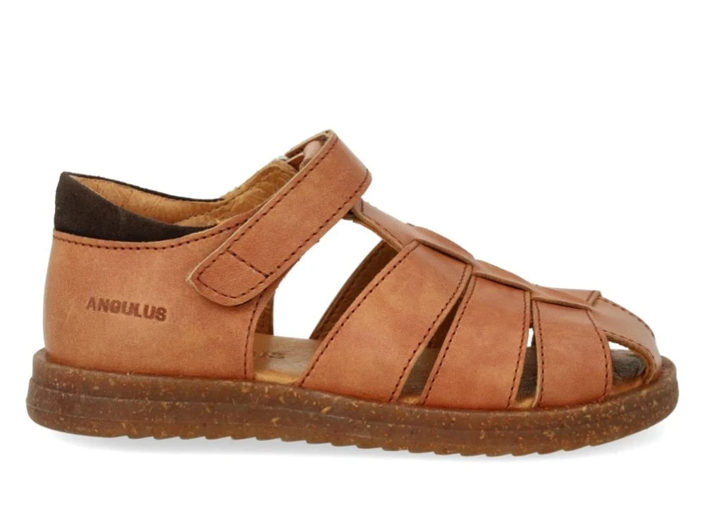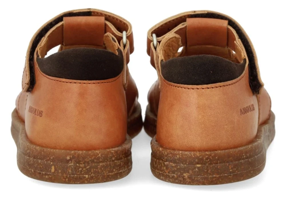 Angulus sandal i farven tan med mørkebrun detalje øverst på hælkappen.