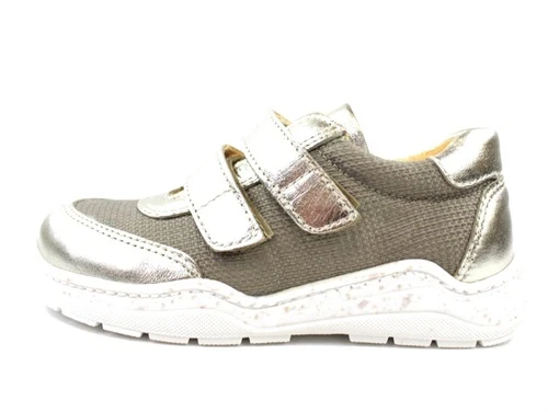 Sneakers i champagnefarvet læder og beigegrå tekstil fra Angulus. Lukkes med to velcroremme.
