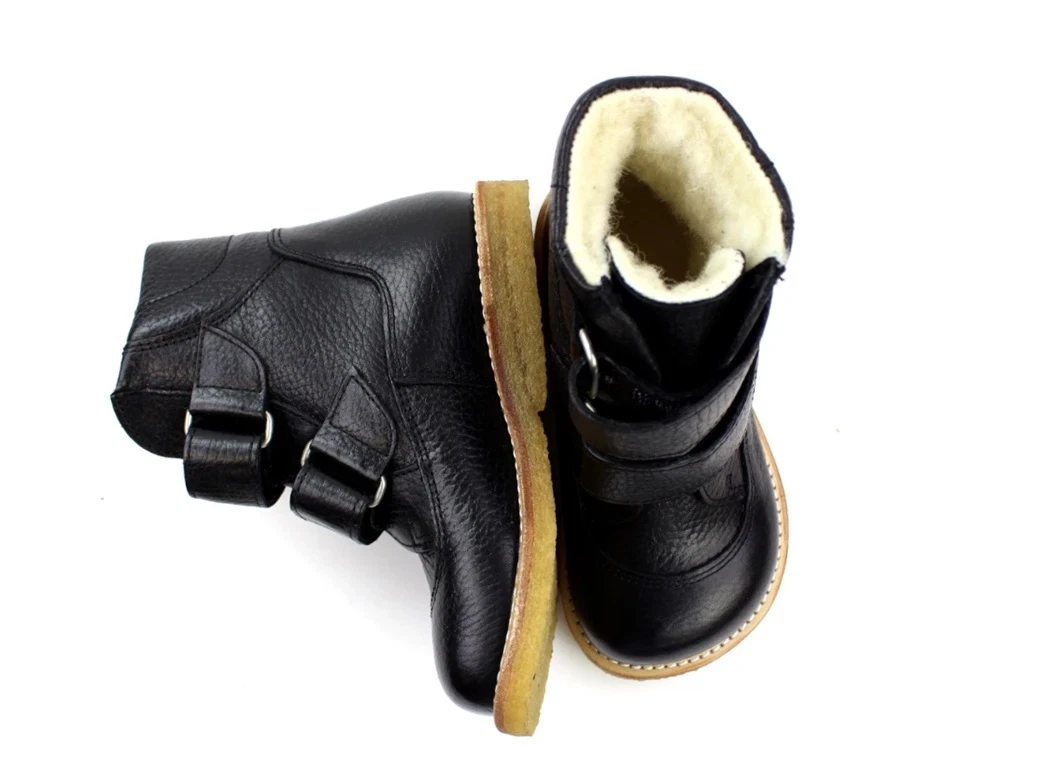 Angulus klassisk vinterstøvle i sort læder. Støvlen har uldfoer og tex og lukkes nemt med to velcroremme.
