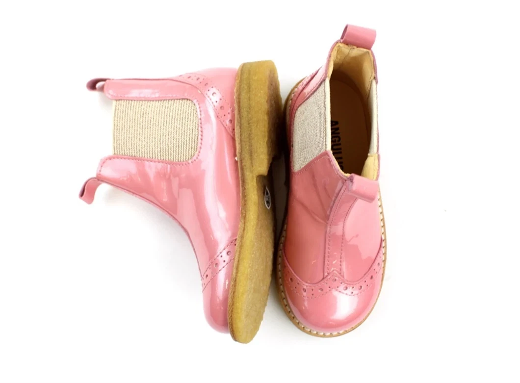Smal støvlette med lak og hulmønster fra Angulus. Støvletten har en elastik med glimmerstriber i siderne og rågummisåler.