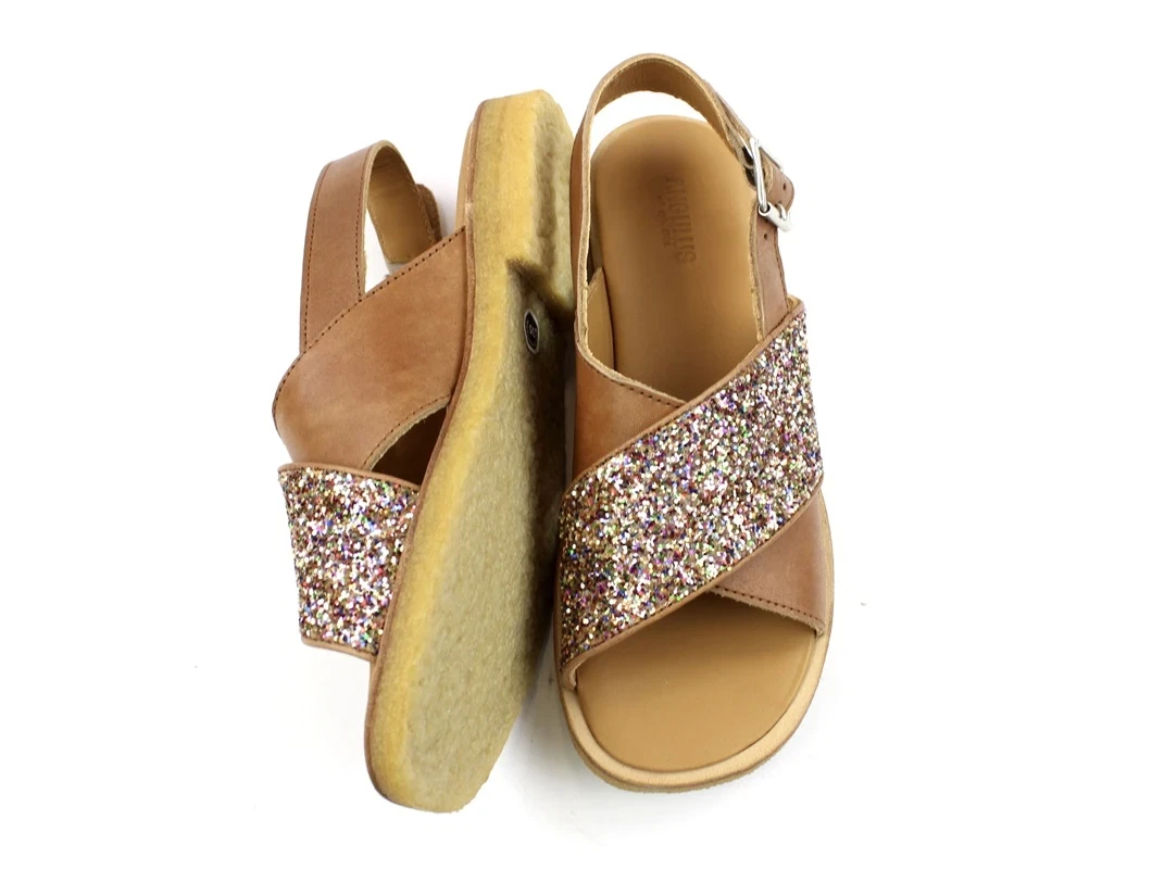 Sandal i tanfarvet læder med multifarvet glimmer fra Angulus.