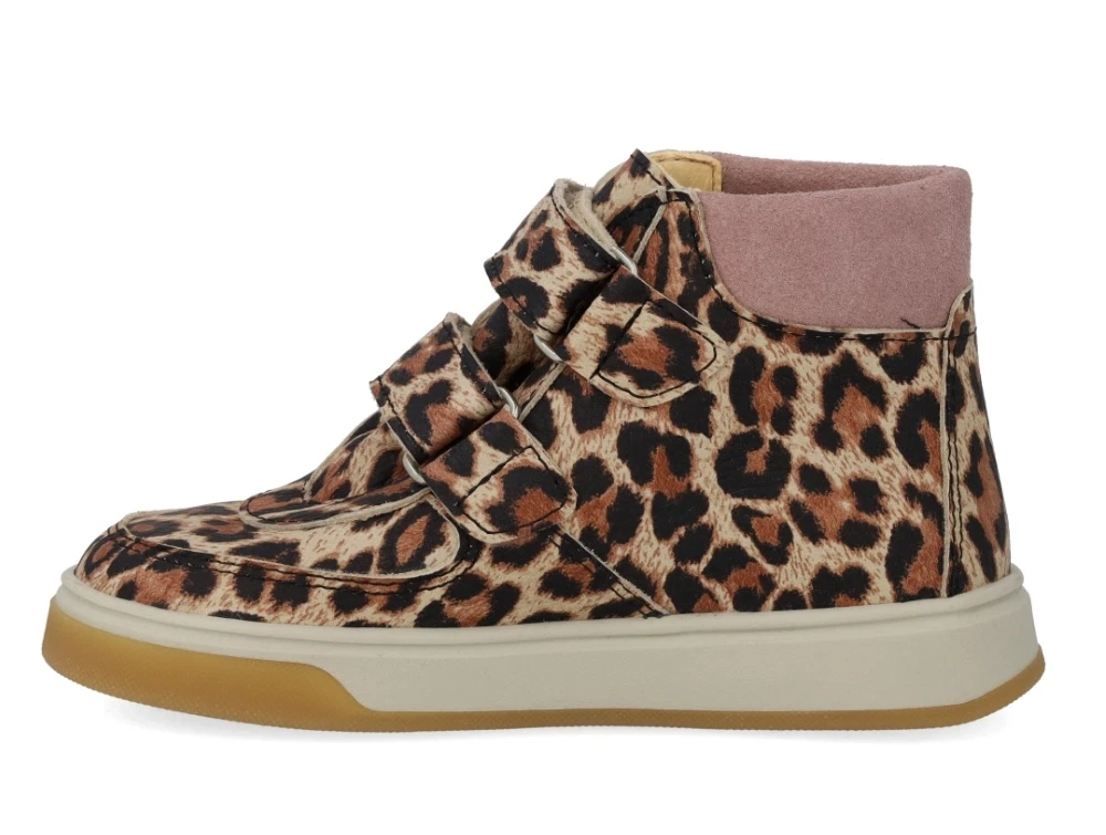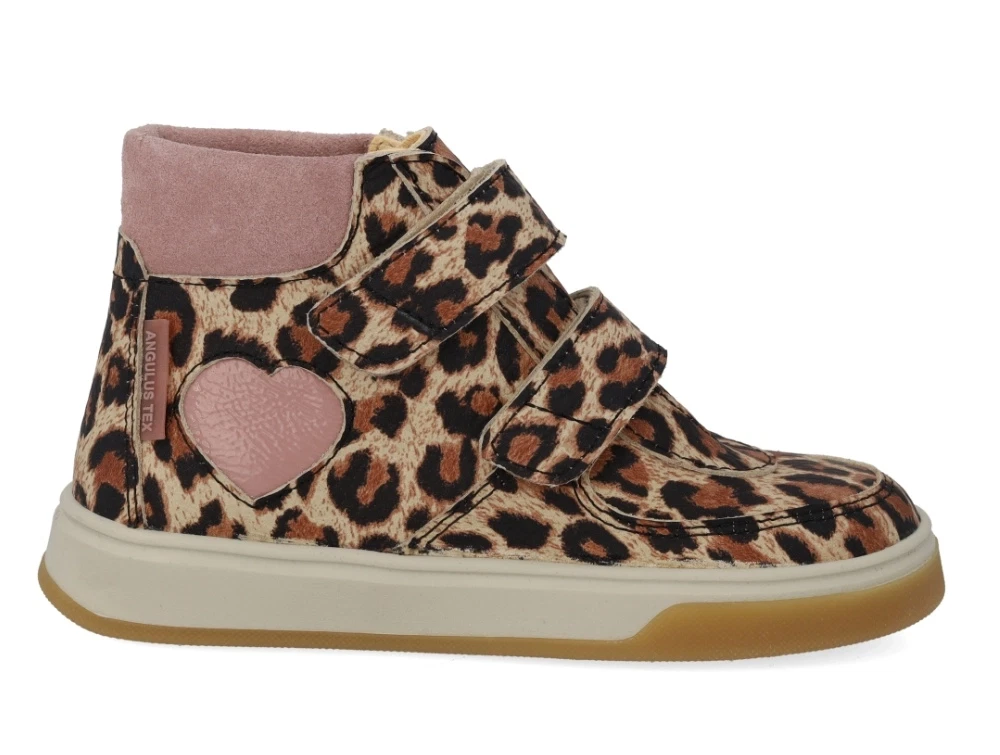 High-top TEX-sneaker i beige leopardprint fra Angulus med rosa hjerte-detalje i lak. Modellen er udstyret med to justerbare velcroremme, som gør det nemt at tilpasse skoen til barnets fod. Den polstrede ruskindskrave giver ekstra komfort omkring anklen.