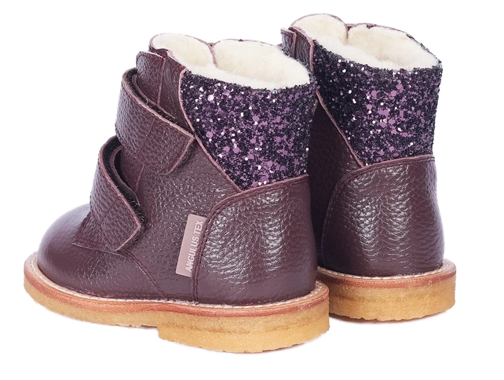 TEX-vinterstøvle i auberginefarvet skind fra Angulus med glimmerdetalje på hælen. Støvlen er designet med rund snude, to justerbare velcroremme og en fast hælkappe med polstret krave for ekstra støtte og komfort. Den er foret med blødt merinould, mens den PFAS-fri TEX-membran beskytter mod sne og slud.