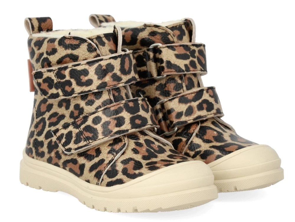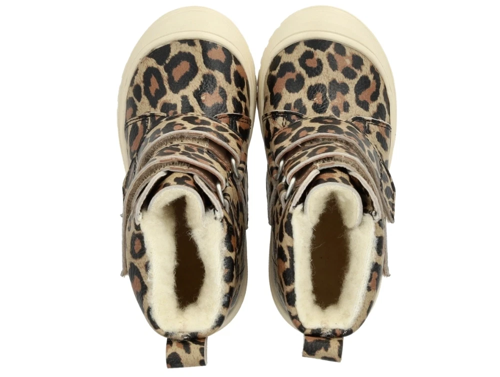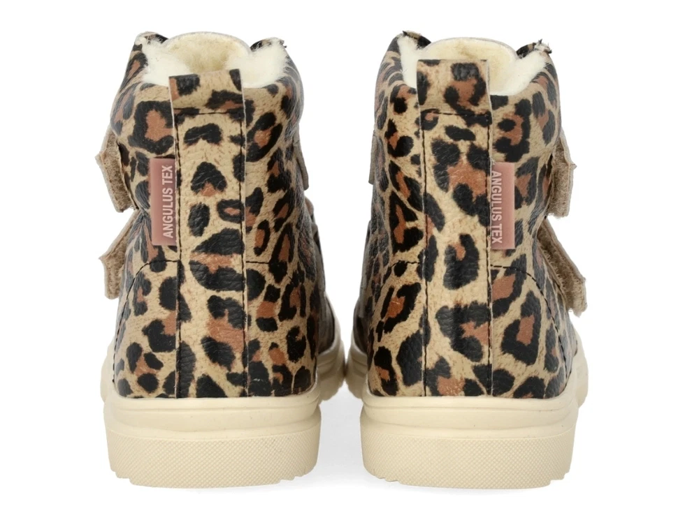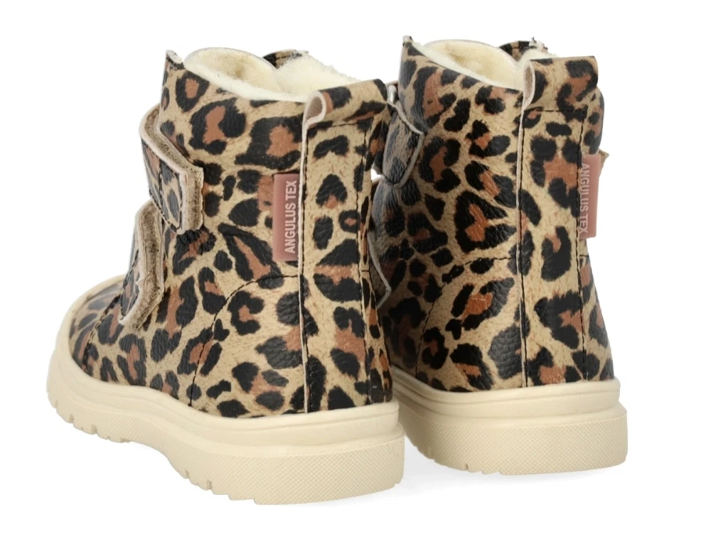 TEX-vinterstøvle i skind fra Angulus med beige leo-print. Støvlen er designet med rund snude, to justerbare velcroremme og en praktisk hælstrop. Den er foret med åndbart og kromfrit merino uld, der holder fødderne varme, mens den PFAS-fri TEX-membran beskytter mod sne og slud.