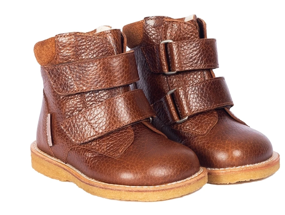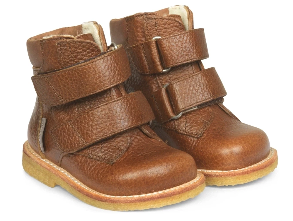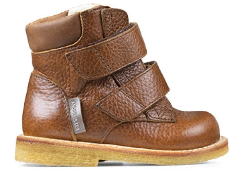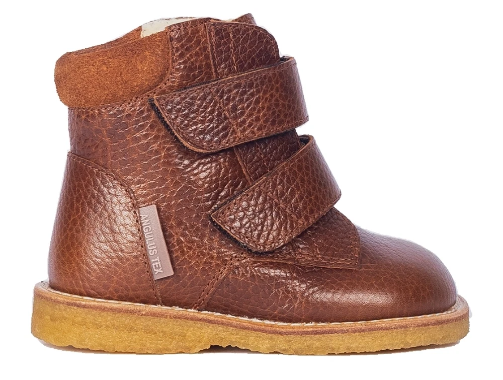 TEX-vinterstøvle i cognac læder fra Angulus. Støvlen har et klassisk look med to justerbare velcroremme, der gør den nem at få af og på. Den er designet til at holde små fødder varme og tørre gennem vintersæsonen.