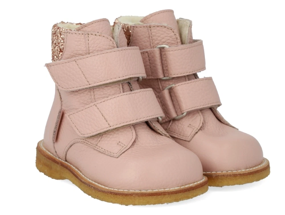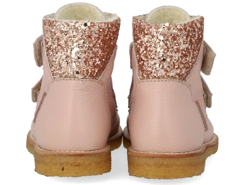 TEX-vinterstøvle i rosa nuance i skind fra Angulus med glimmer på hælen. Støvlen er designet med rund snude, to justerbare velcroremme og en fast hælkappe med polstret krave for ekstra støtte og komfort. Den er foret med blødt merinould, mens den PFAS-fri TEX-membran beskytter mod sne og slud.