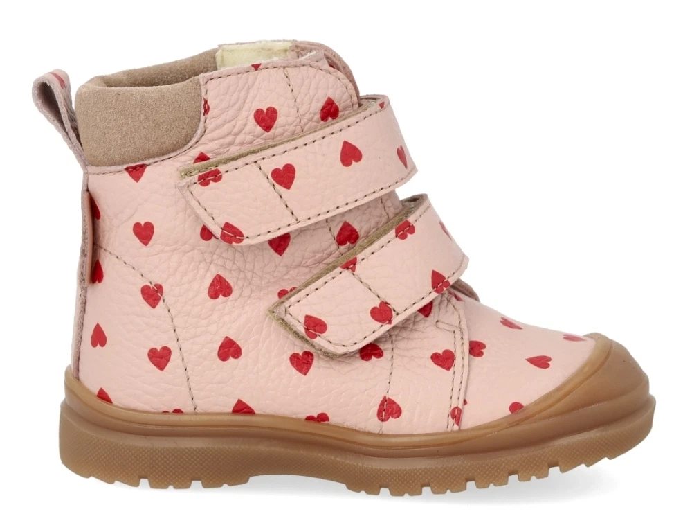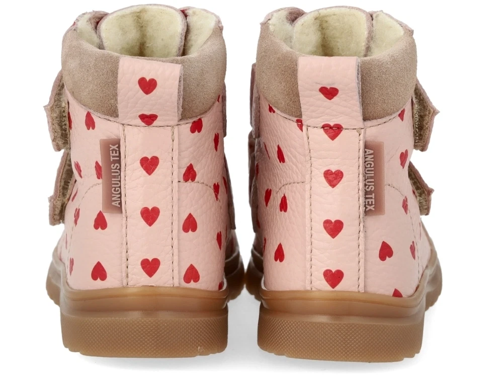TEX-vinterstøvle i rosa skind fra Angulus med rødt hjerteprint. Støvlen er designet med rund snude, to justerbare velcroremme og en praktisk hælstrop. Den er foret med merinould, mens den PFAS-fri TEX-membran beskytter mod sne og slud.
