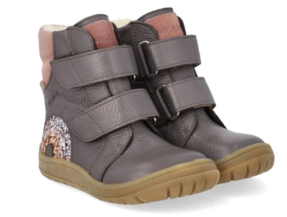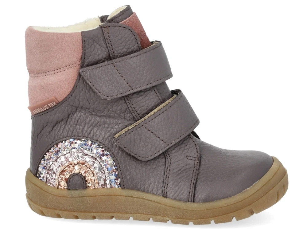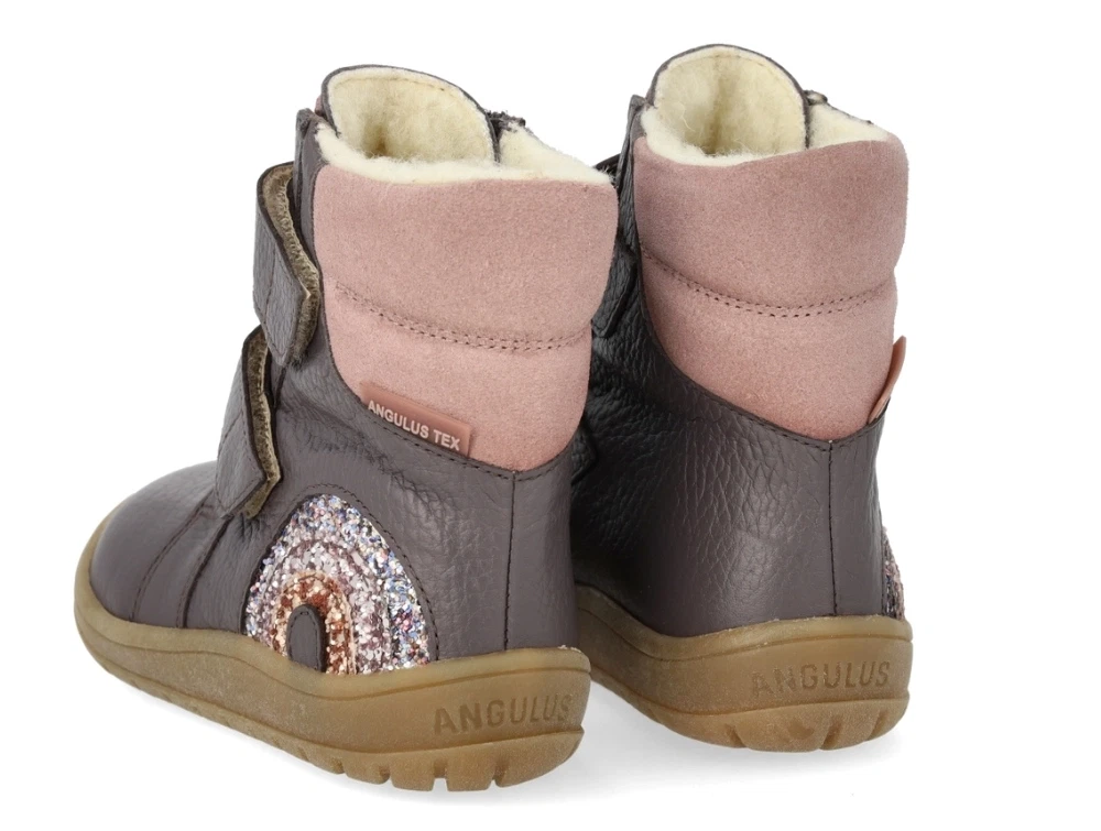 TEX-vinterstøvle i lavendelfarvet skind fra Angulus med en funklende glitterregnbue. Støvlen er designet med rund snude, to justerbare velcroremme og en fast hælkappe med polstret kontrastkrave for ekstra komfort og støtte. Den er foret med blødt merinould, mens den PFAS-fri TEX-membran beskytter mod sne og slud.