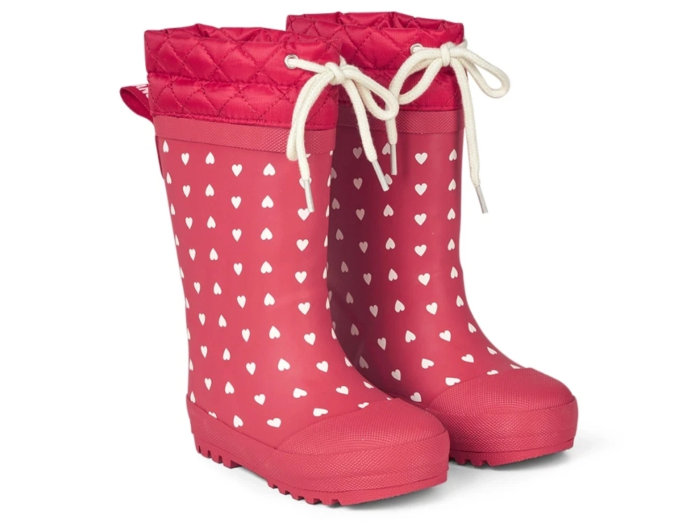 Rød vintergummistøvle i naturgummi fra Angulus med sødt hjerteprint. Modellen har quiltet overdel med snørelukning, logostrop bagtil og refleksdetalje på hælen. Indvendigt er støvlen foret med en blanding af uld og polyester, som gør den velegnet på kolde og våde vinterdage. Støvlerne er normale til lidt store i størrelsen.