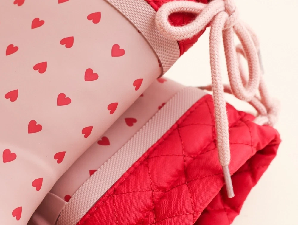 Rosa vintergummistøvle i naturgummi fra Angulus med sødt hjerteprint. Modellen har quiltet overdel med snørelukning, logostrop bagtil og refleksdetalje på hælen. Indvendigt er støvlen foret med en blanding af uld og polyester, som gør den velegnet på kolde og våde vinterdage. Støvlerne er normale til lidt store i størrelsen.