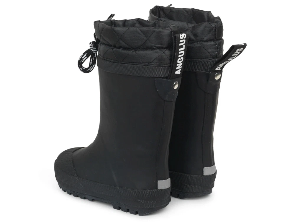Sort vintergummistøvle i naturgummi fra Angulus. Modellen har quiltet overdel med snørelukning, logostrop bagtil og refleksdetalje på hælen. Indvendigt er støvlen foret med en blanding af uld og polyester, som giver varme og komfort på kolde og våde vinterdage. Støvlerne er normale til lidt store i størrelsen.