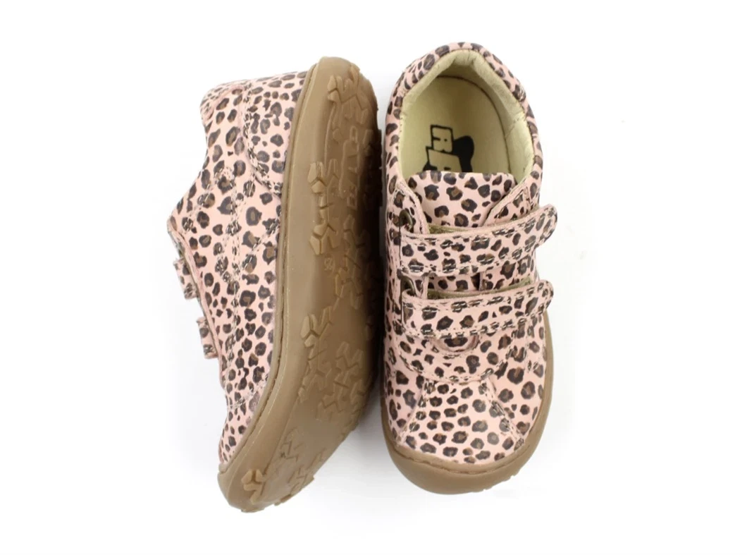 Sko i nubuk i farven/printet nude leo fra Arauto RAP med praktisk gummisål. Skoene tages let af og på ved hjælp af to velcroremme.