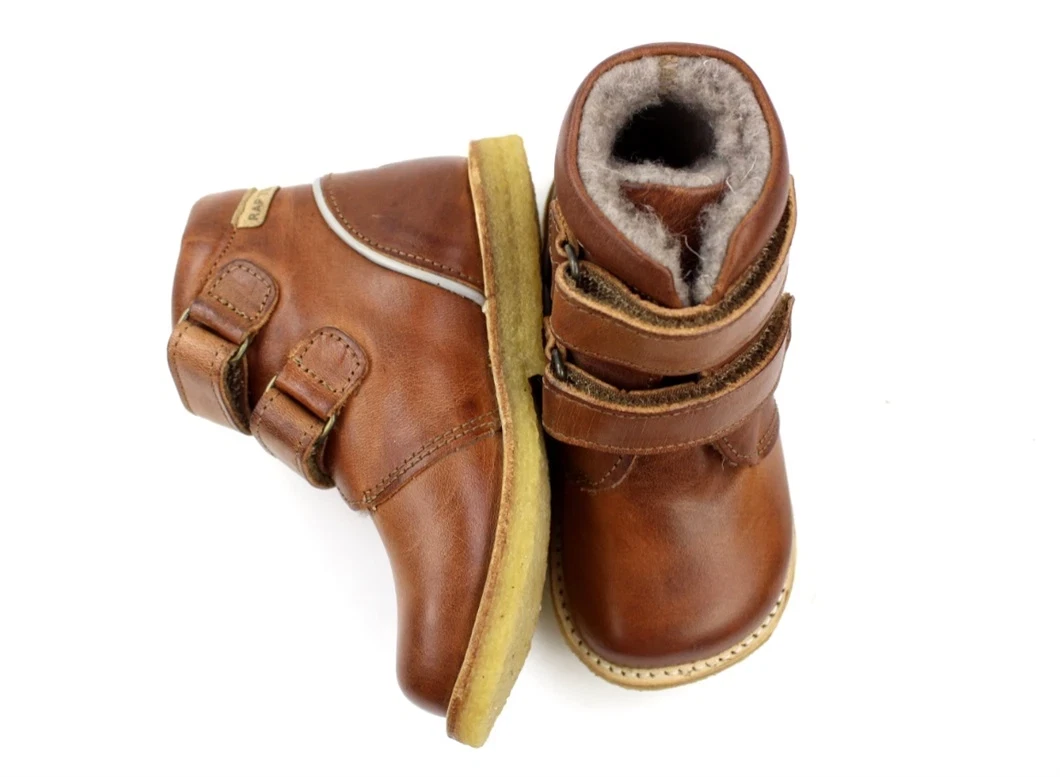 Smal cognacfarvet kort lædervinterstøvle fra Arauto RAP med ægte uldfoer, rågummisåler og TEX-membran.