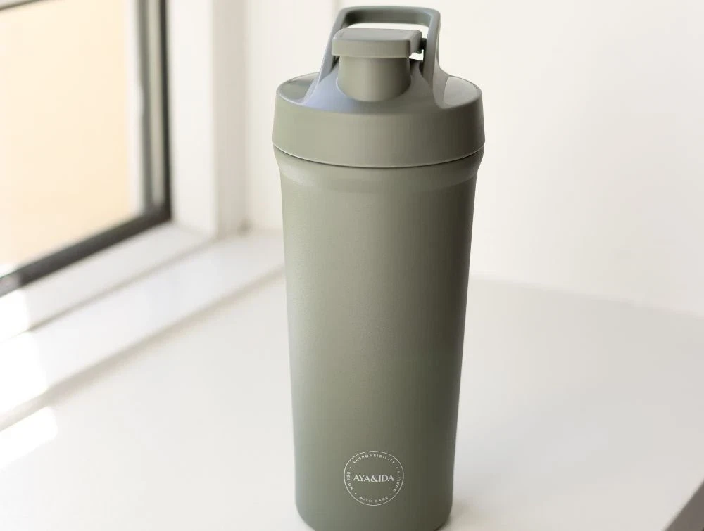 AYA&IDA Shaker Bottle er en praktisk sportsdrikkeflaske designet til at imødekomme dine behov under træningen, hvad enten det er som vandflaske eller protein shaker. Flasken er fremstillet af rustfrit stål med et låg i polypropylen plast. Flasken er designet til hurtig brug, uden behov for termofunktion, hvilket gør den perfekt til en hurtig shake inden eller efter din træning.