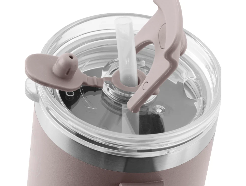 Koppen er fremstillet af rustfrit stål, låget er lavet af tritan, og sugerøret er fremstillet af platinum silikone. Alle materialer er fri for skadelig kemi, og koppen er laboratoriecertificeret til at opfylde LFGB (food-grade testing). Den kan desuden tåle opvaskemaskine og leveres med et ekstra sugerør.