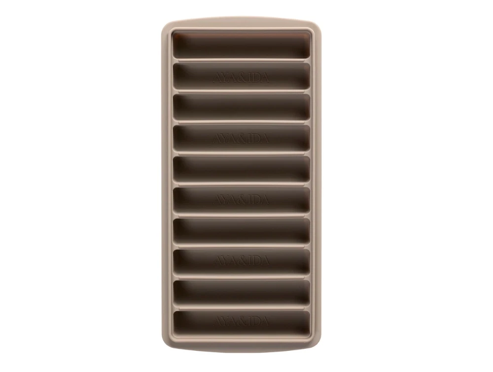 Isterningebakke i i flot brun nuance (driftwood) fra Aya&Ida. Formen giver aflange, smalle isterninger, der passer perfekt i Aya og Ida drikkeflasker.