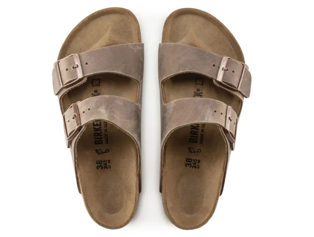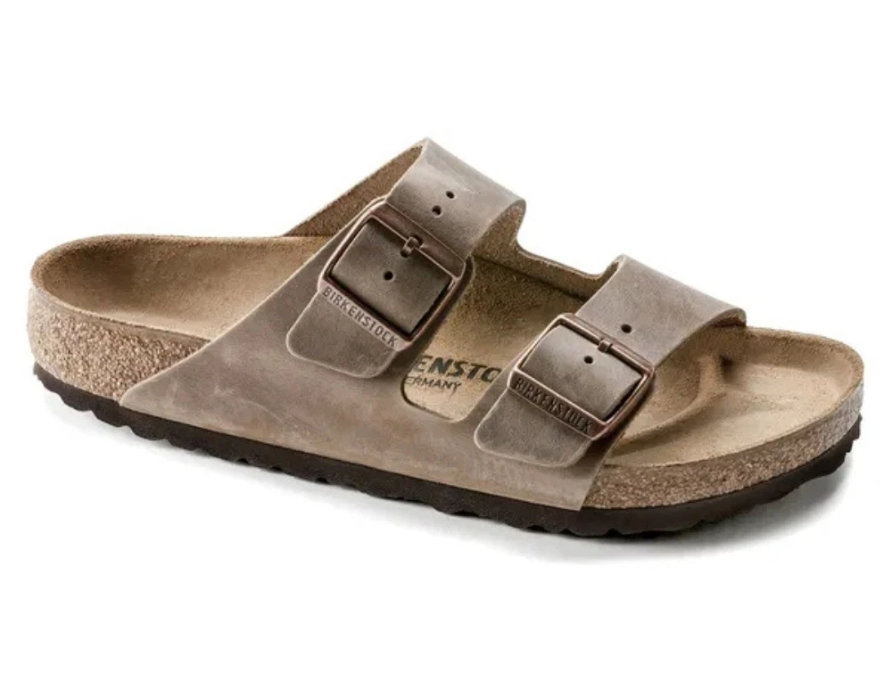 Birkenstock Arizona sandal brun oiled leather med dobbelt spændeBirkenstock Arizona sandal i brun tabacco brown set fra sidenBirkenstock Arizona sandal set ovenfra i brun nuance