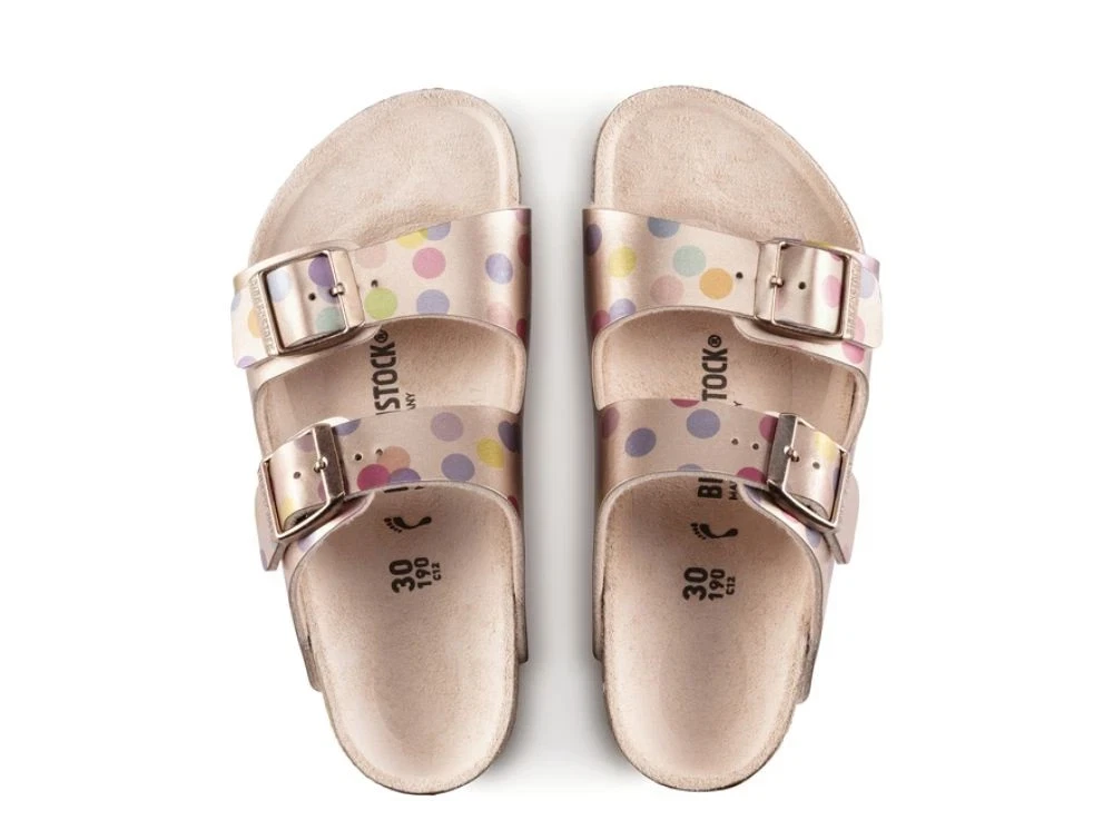 Super fin Arizona-sandal fra Birkenstock i kobber med multifarvede prikker (electric metallics dots copper).
